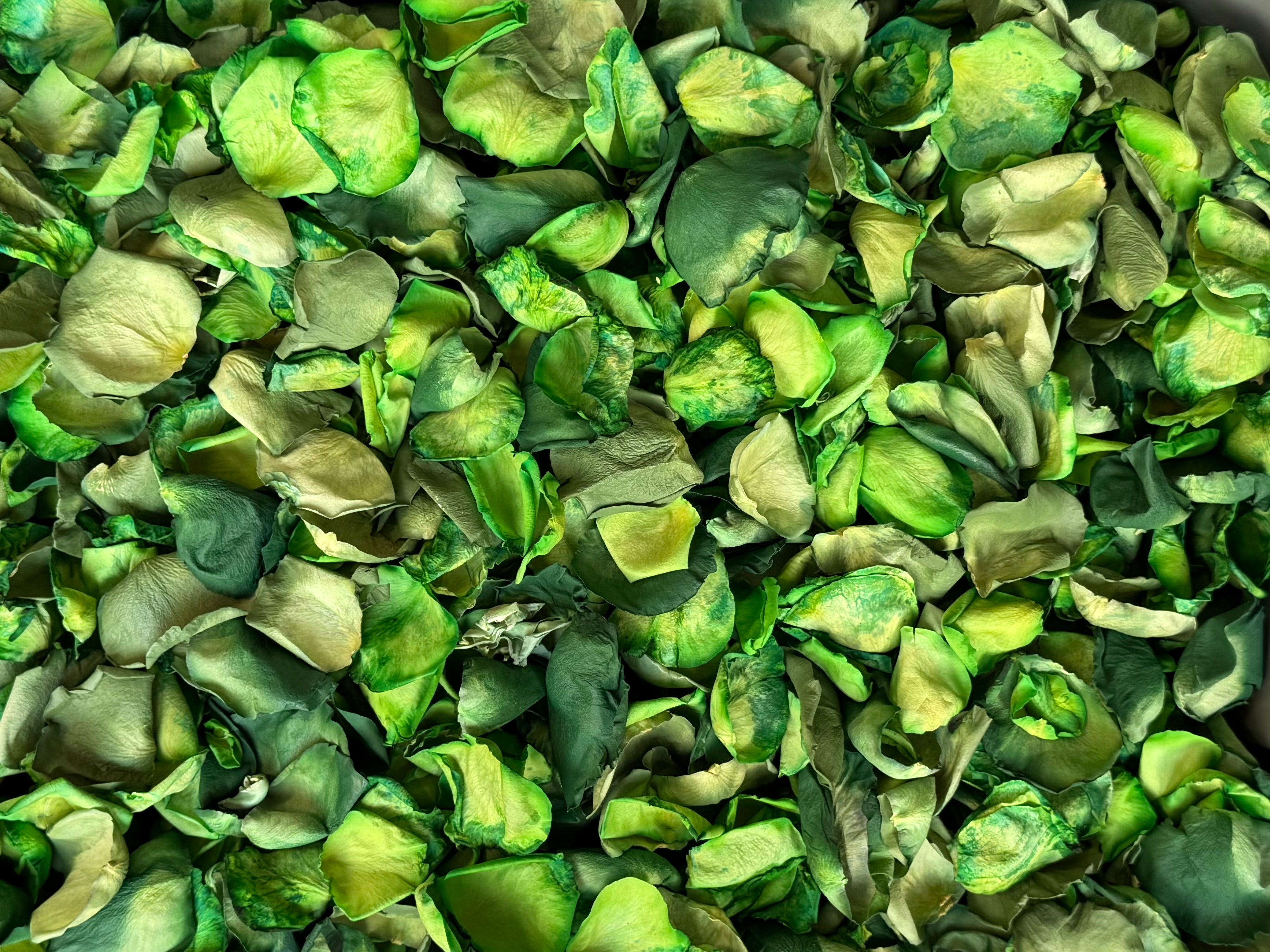Our Green dyed rose petals in our Budget selection typically contains petals that may not have taken the dye well, are outer guard petals, or are past their prime and have yellowed.